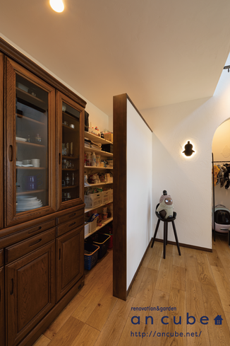 キッチン横のパントリーは扉は付けず、間仕切り壁で目隠しを。使い勝手良く、生活感をなくす設計に◎